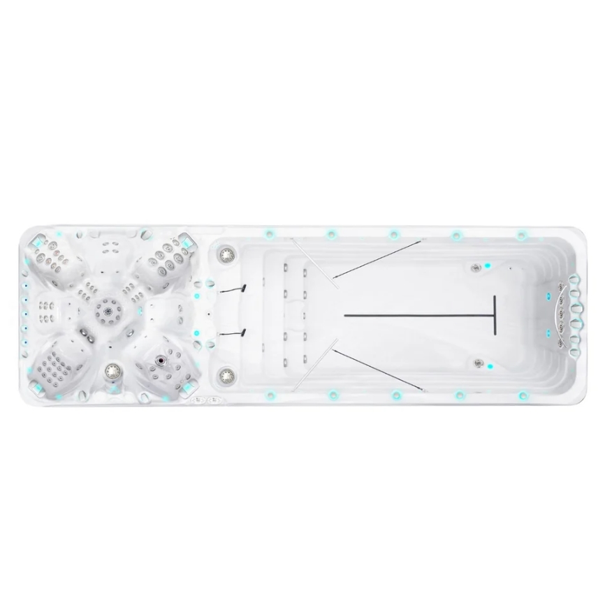 - Система River Swim System — пять мощных форсунок создают равномерный поток воды по всей ширине бассейна, обеспечивая комфортное плавание даже при поднятой голове.